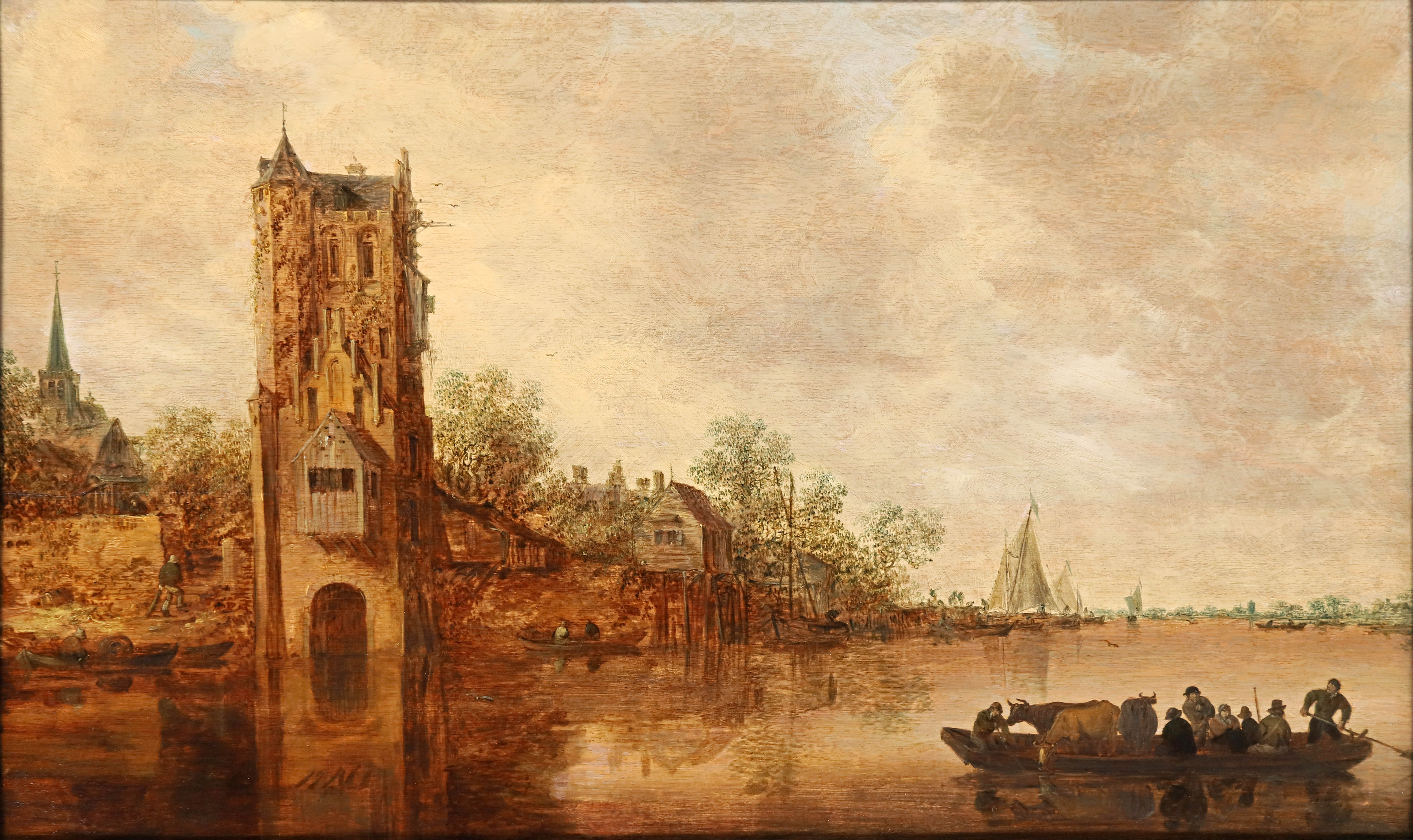 This painting by Van Goyen depicts the Pelkus Gate near Utrecht. It is one of about a dozen paintings by Van Goyen that depicted the Pelkus gate, a freestanding tower on the river Vecht that disappeared by the 18th century. Van Goyen completed about a dozen paintings depicting some form of the Pelkus gate. Each of the paintings’ surroundings and structures vary greatly, suggesting that they were invented by van Goyen.