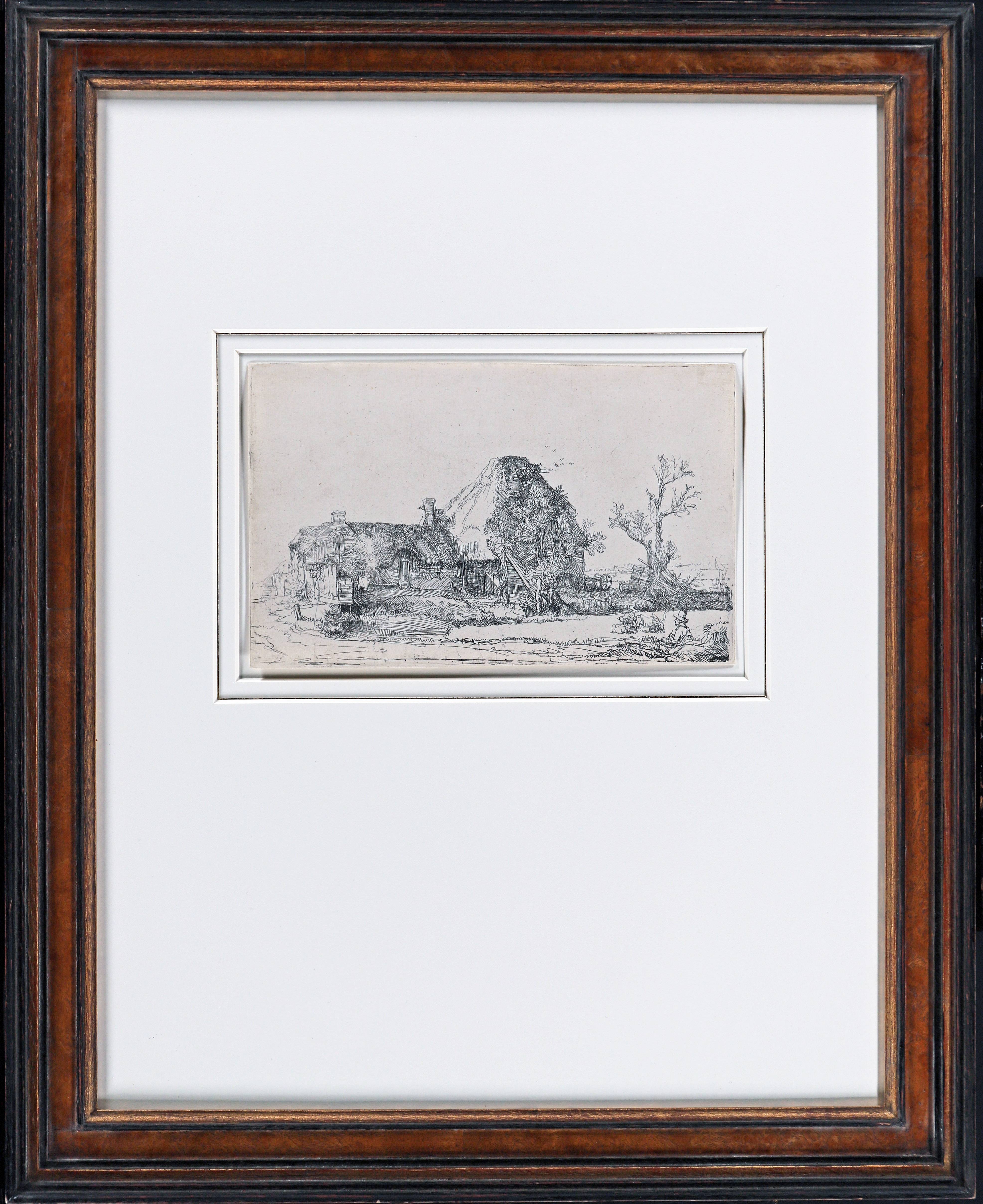 A humble, rather dilapidated farmhouse is a subject that recurs in many of Rembrandt’s landscape etchings. The level of detail implies that he, like the artist shown drawing in the foreground at right, had oftentimes sketched such places en plein air. Whilst the little figure of the draughtsman is a reflection figure rather than a self-portrait- the artist depicted here has a beard – Rembrandt has adopted a very similar low viewpoint as him. Whether or not Rembrandt actually drew this plate from life and in situ – the result is full of charming, incidental detail and the print is one the most cheerful and light-hearted of all his landscapes.