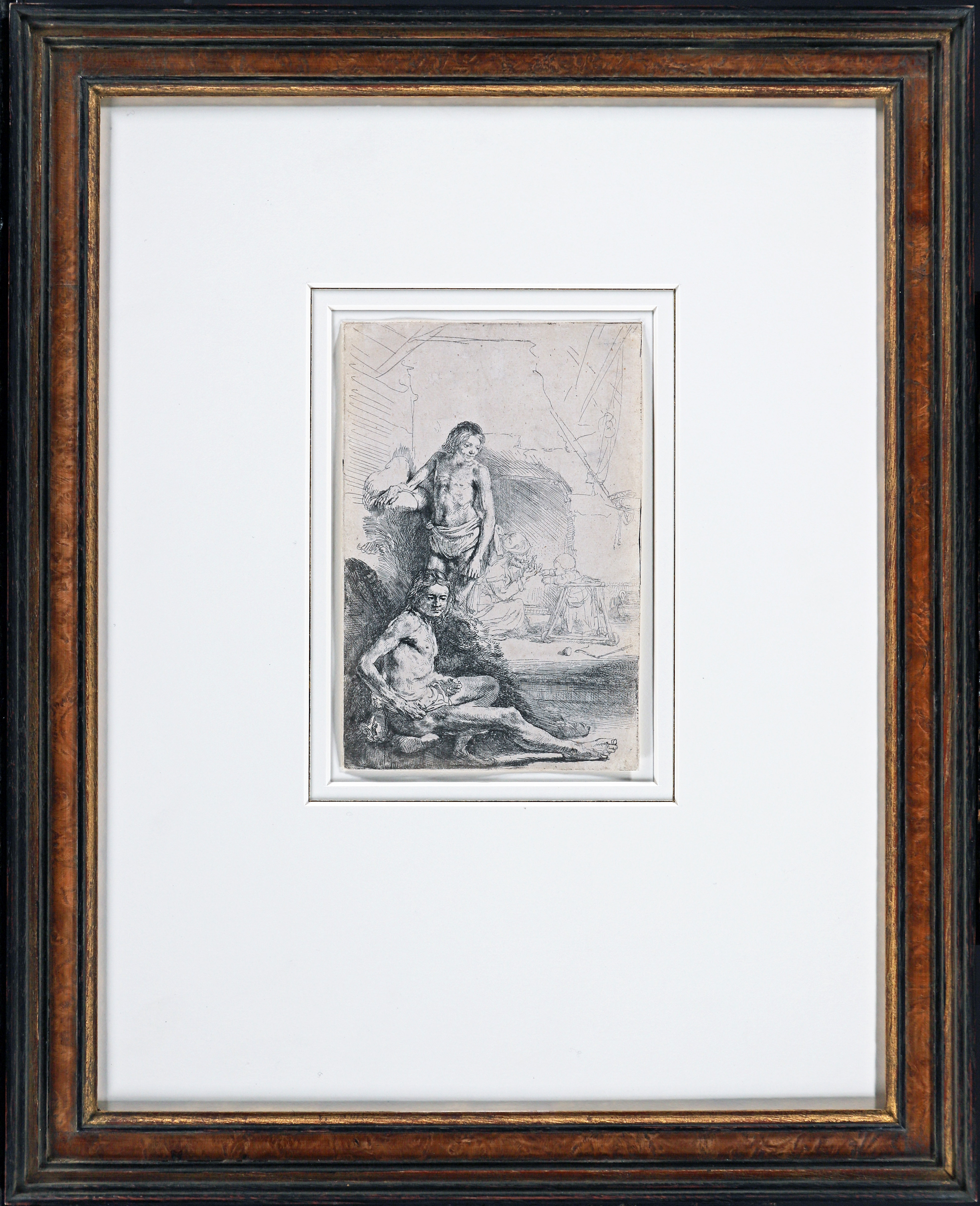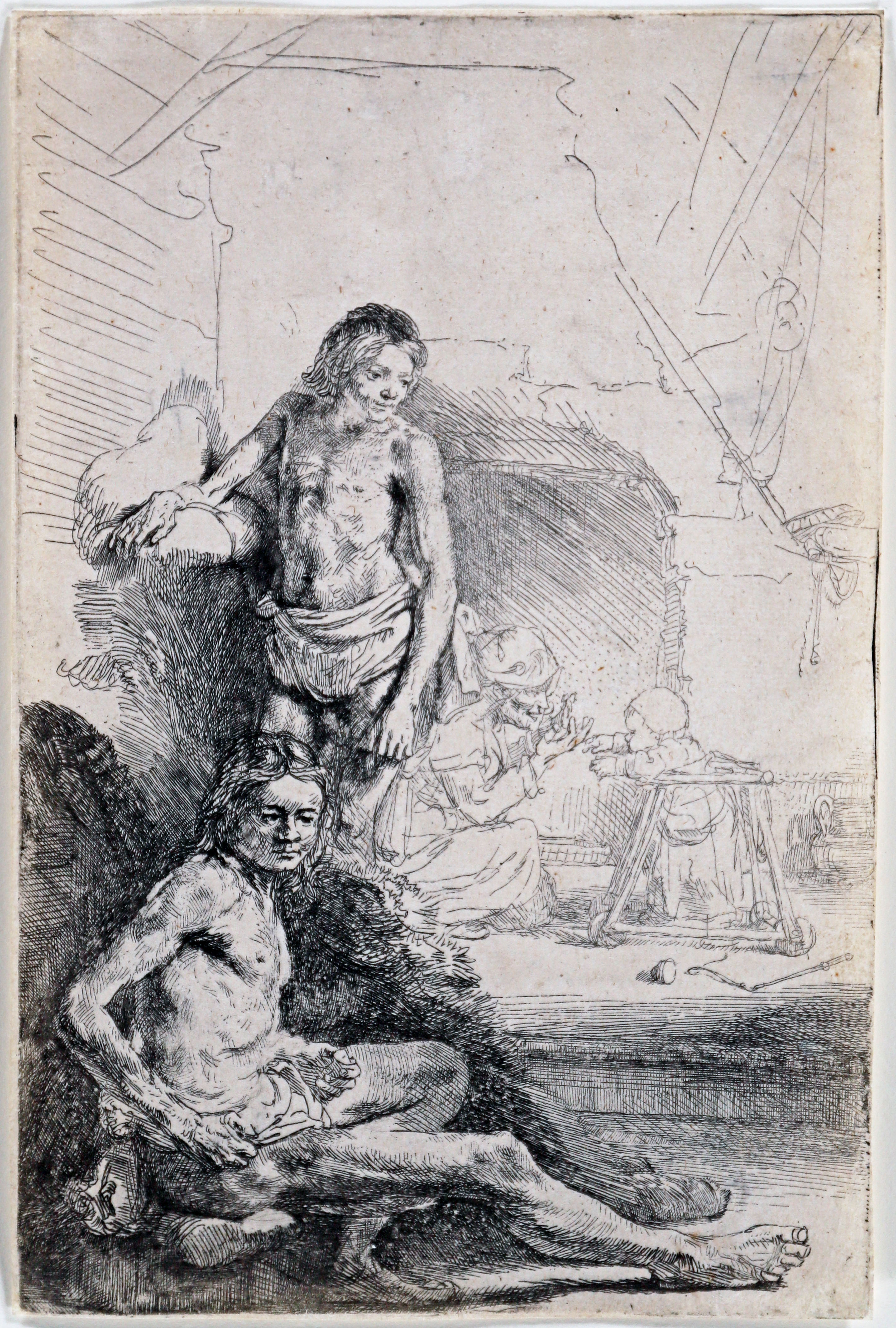 A fine lifetime impression of the first state, printed with plate tone. With false biting, resulting in irregular white spots, typical for the earliest state. It is likely that Rembrandt’s studies of male nudes, all created in 1646 from the same models, were part of a cohesive series. This particular sheet is especially intriguing due to the background scene: a young child, standing in a wheeled walker, is learning to walk in a Dutch kitchen with an open hearth, while a maid watches over him. The juxtaposition of two entirely distinct subjects in one composition is rare in Rembrandt’s work.
