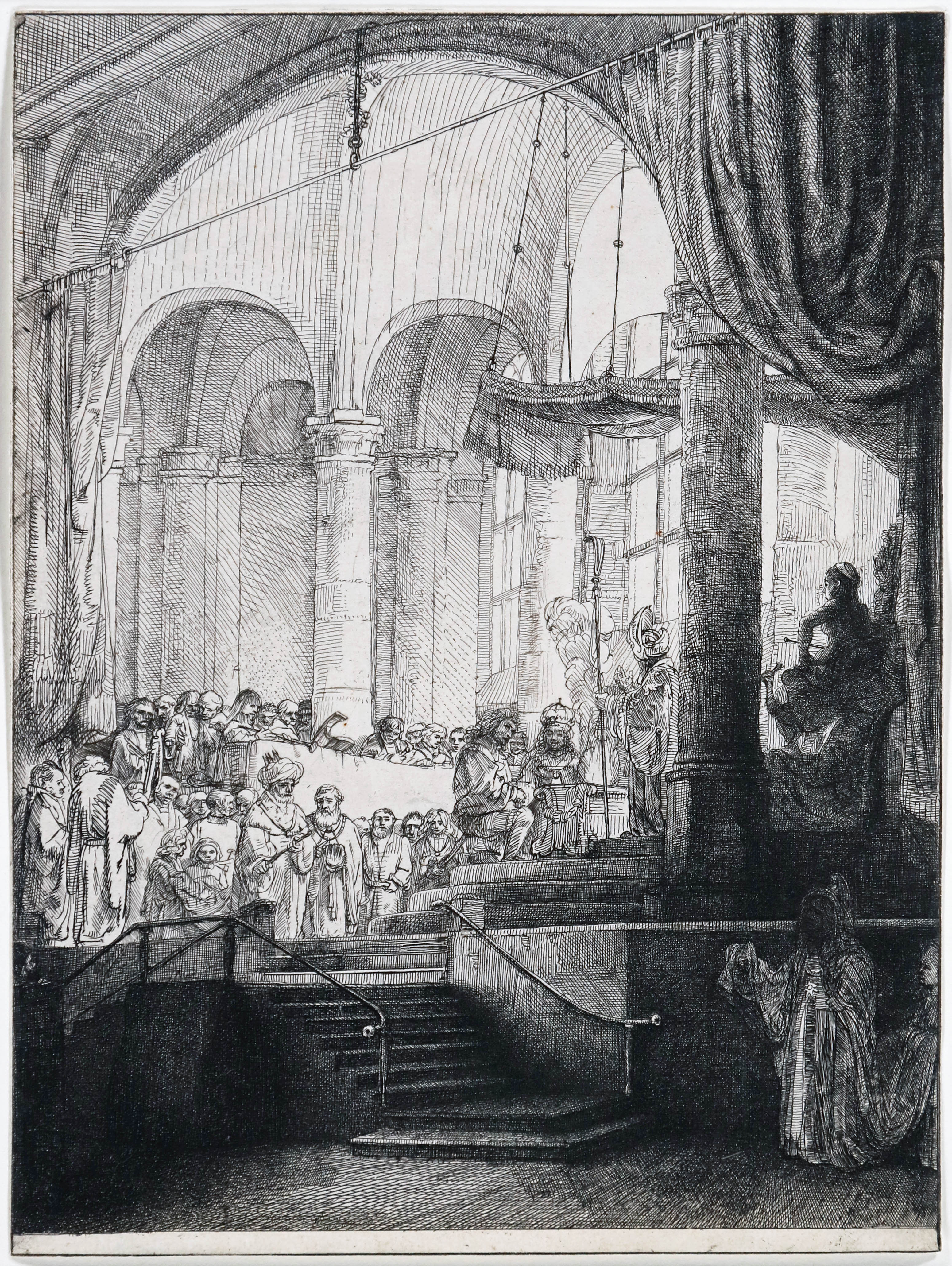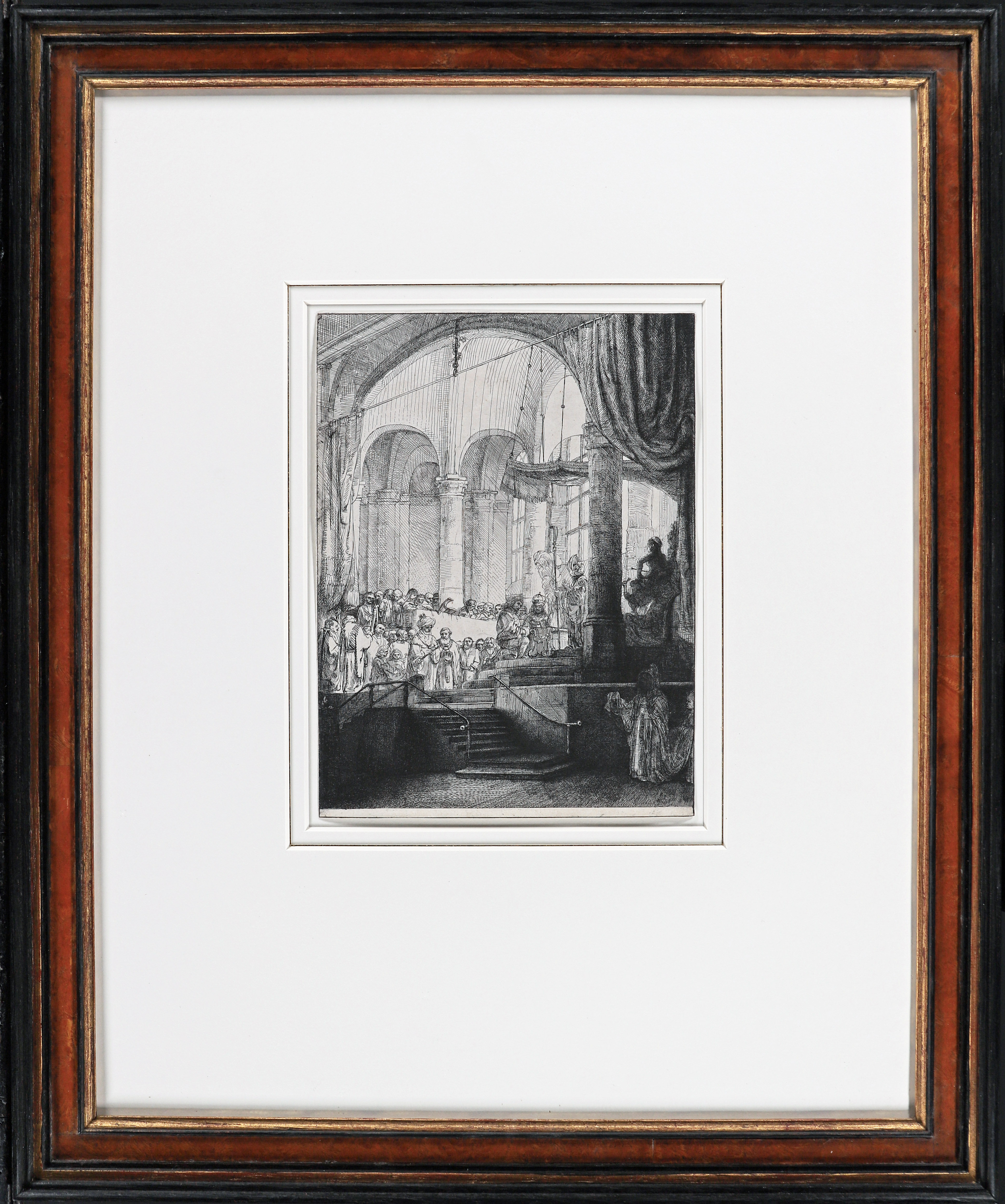 A superb, atmospheric lifetime impression of the first state, before the extension of Medea’s robe and that of her servant, which was added with drypoint. The sculpted figure of Juno is wearing a cap, which was later replaced by a crown. Rembrandt created illustrations for three books, with Medea being his second. Commissioned by Jan Six for the title page of his tragedy, Medea had been performed in October 1647 at the Amsterdam Stadsschouwburg and published twice (1648 and 1679). However, only the fourth state of the etching was used as the frontispiece for the first edition, while the fifth state appeared in deluxe copies of the second edition. Impressions of the first three states—before the signature, date, monogram, and the verses in the lower margin—are rare.