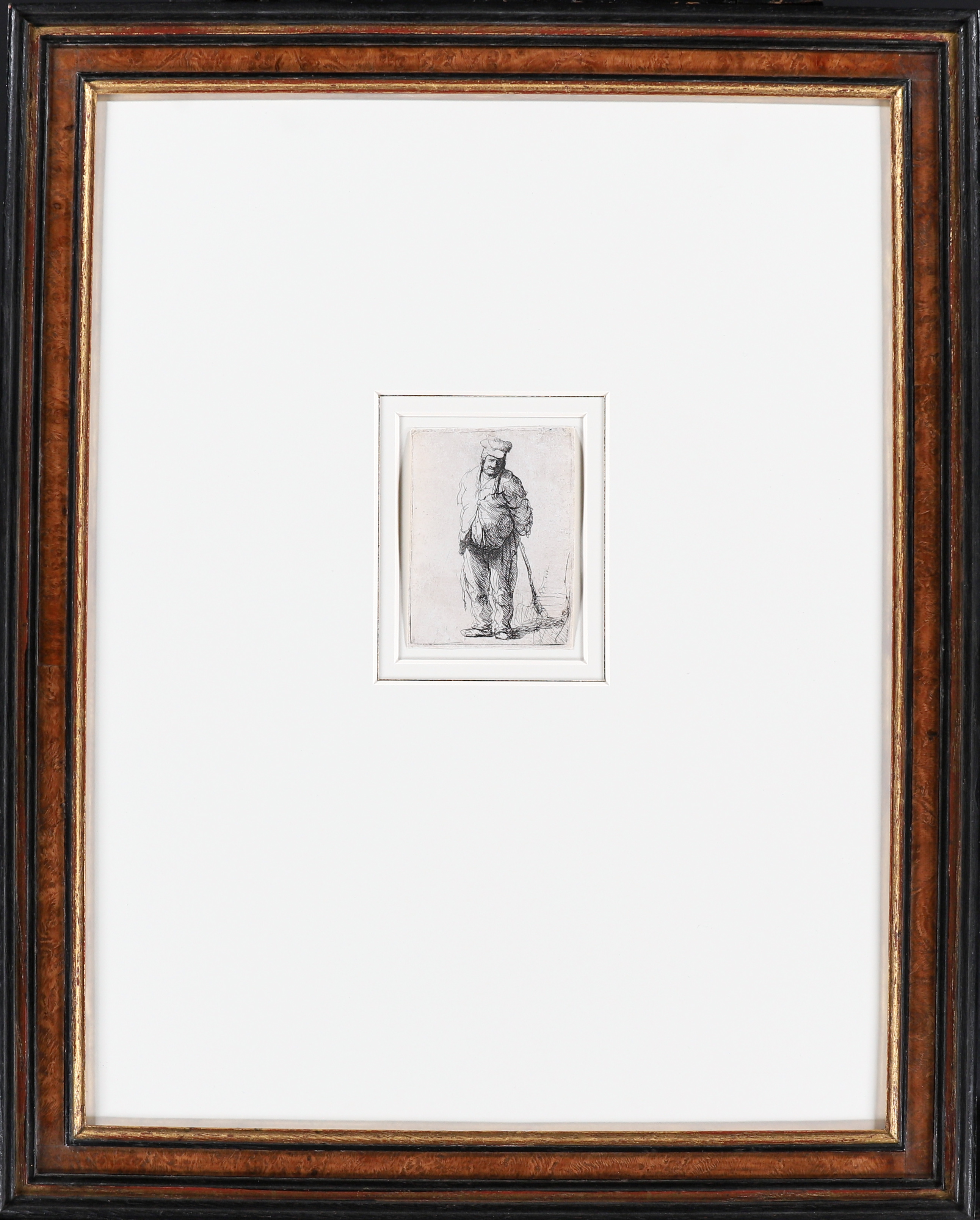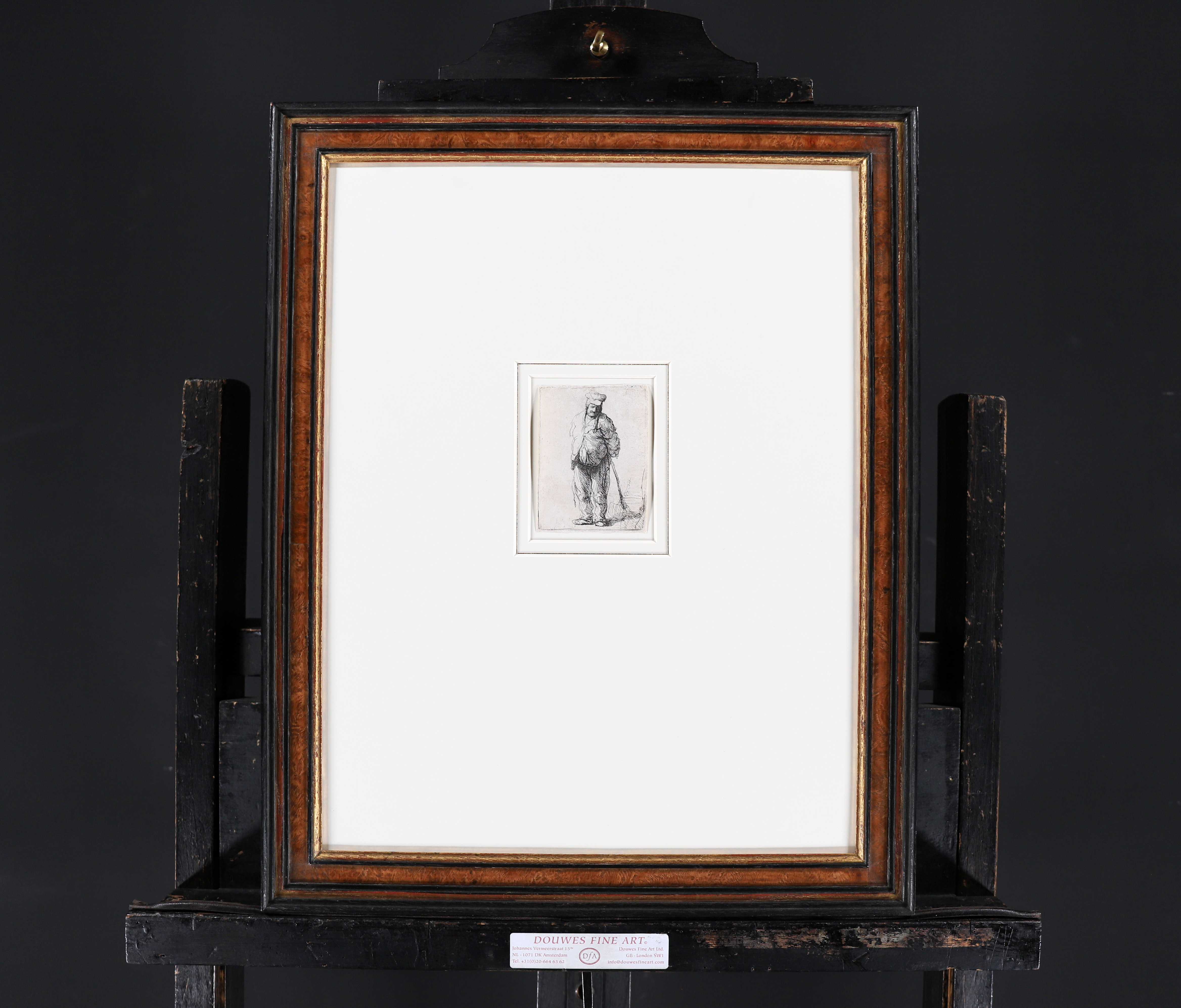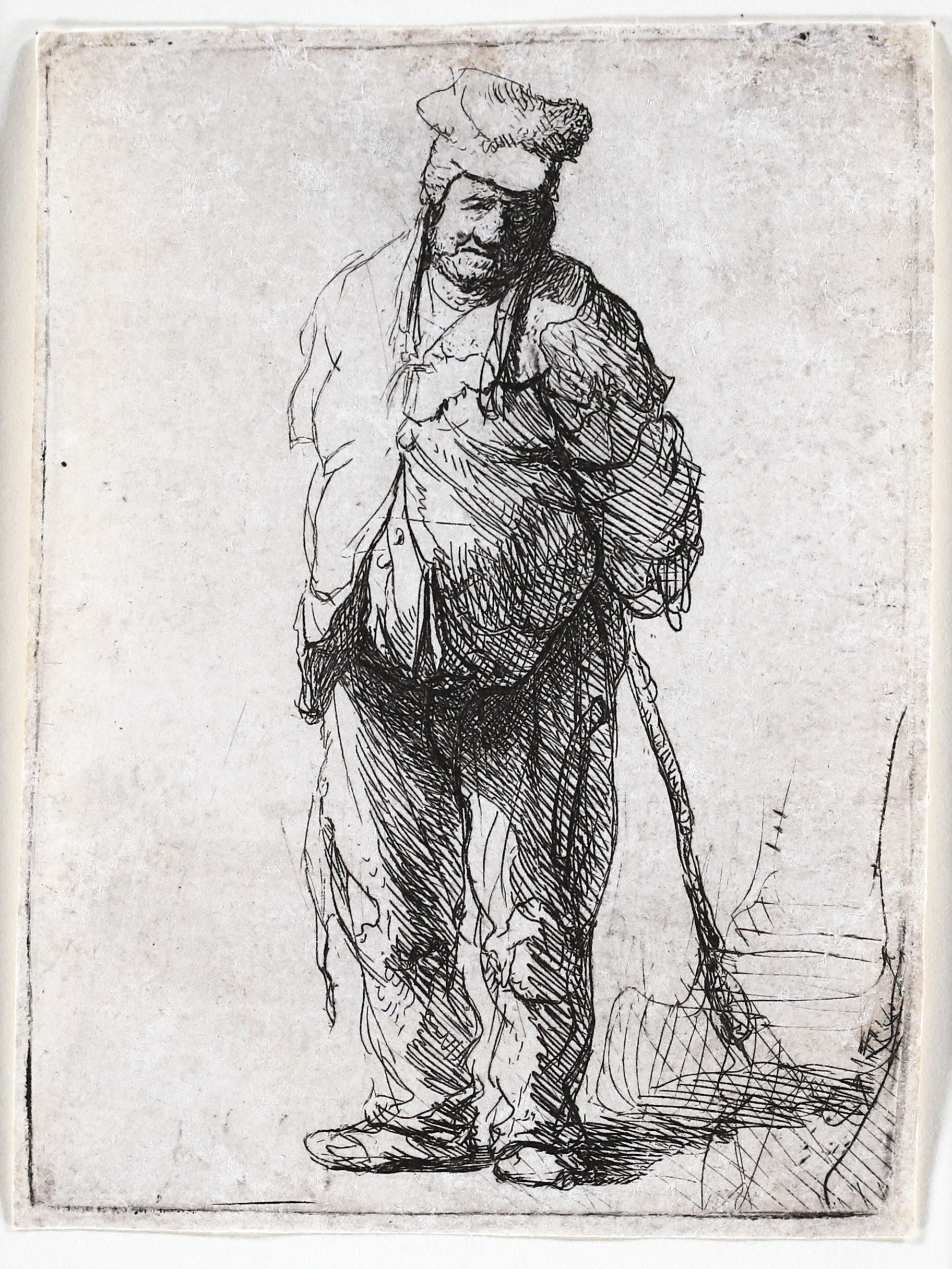 A romantic myth about Rembrandt is that he etched so many beggars – more than thirty etchings in all – because he felt alienated from society himself. It is true that he once portrayed himself as a beggar, but he was more attracted to the expressive faces, tattered clothing, and crumpled gait of these “low” subjects. Unusually for the time, Rembrandt gave his beggars real emotions and individualised faces, seemingly intending to stir compassion in his viewers.