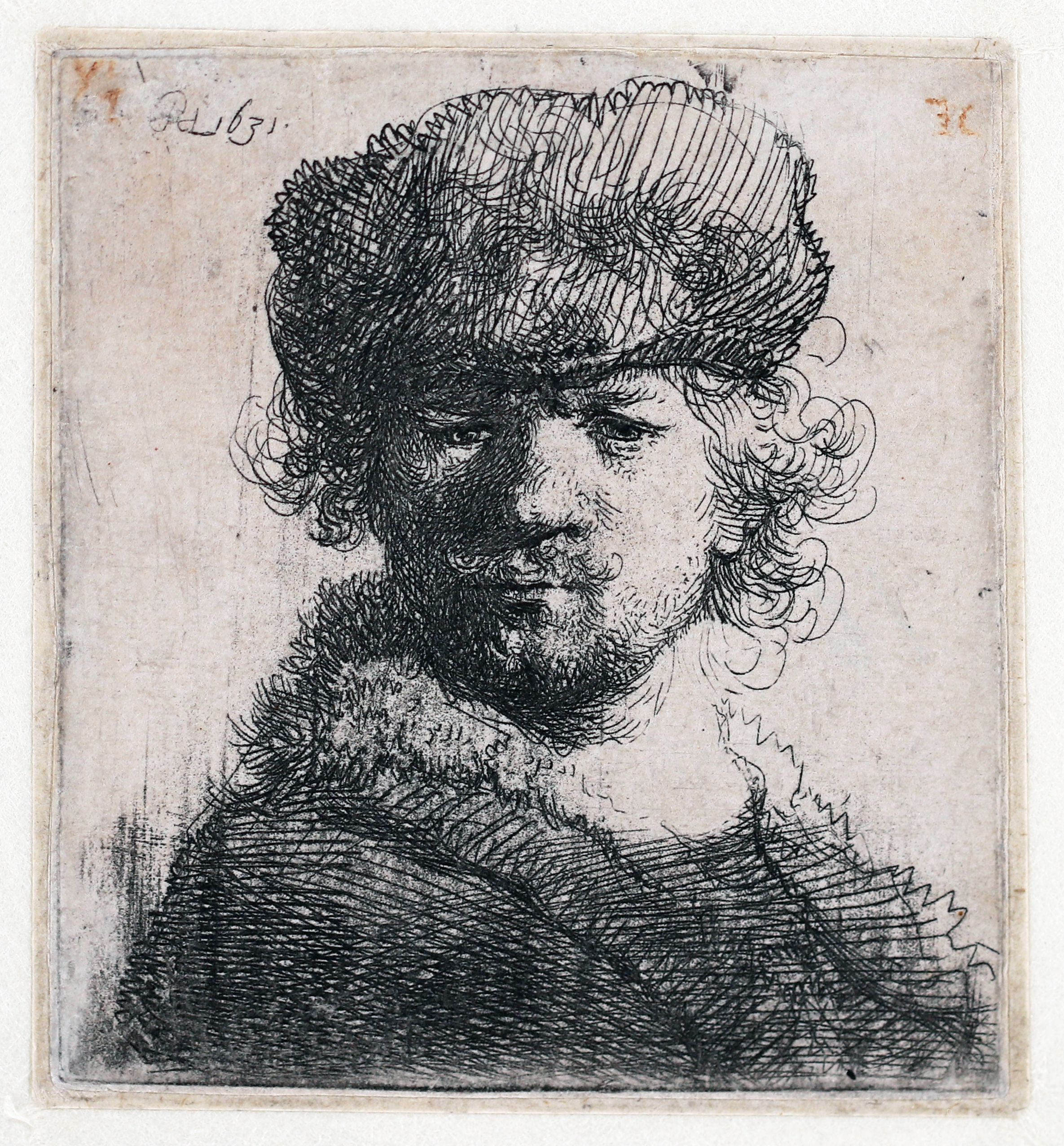 The Self-Portrait in a heavy Fur Cap: Bust exists in one state only. The present impression is printed with a light veil of plate tone, and the smoky vertical band of wiping marks across the left part of the figure adds atmospheric shading to the image.