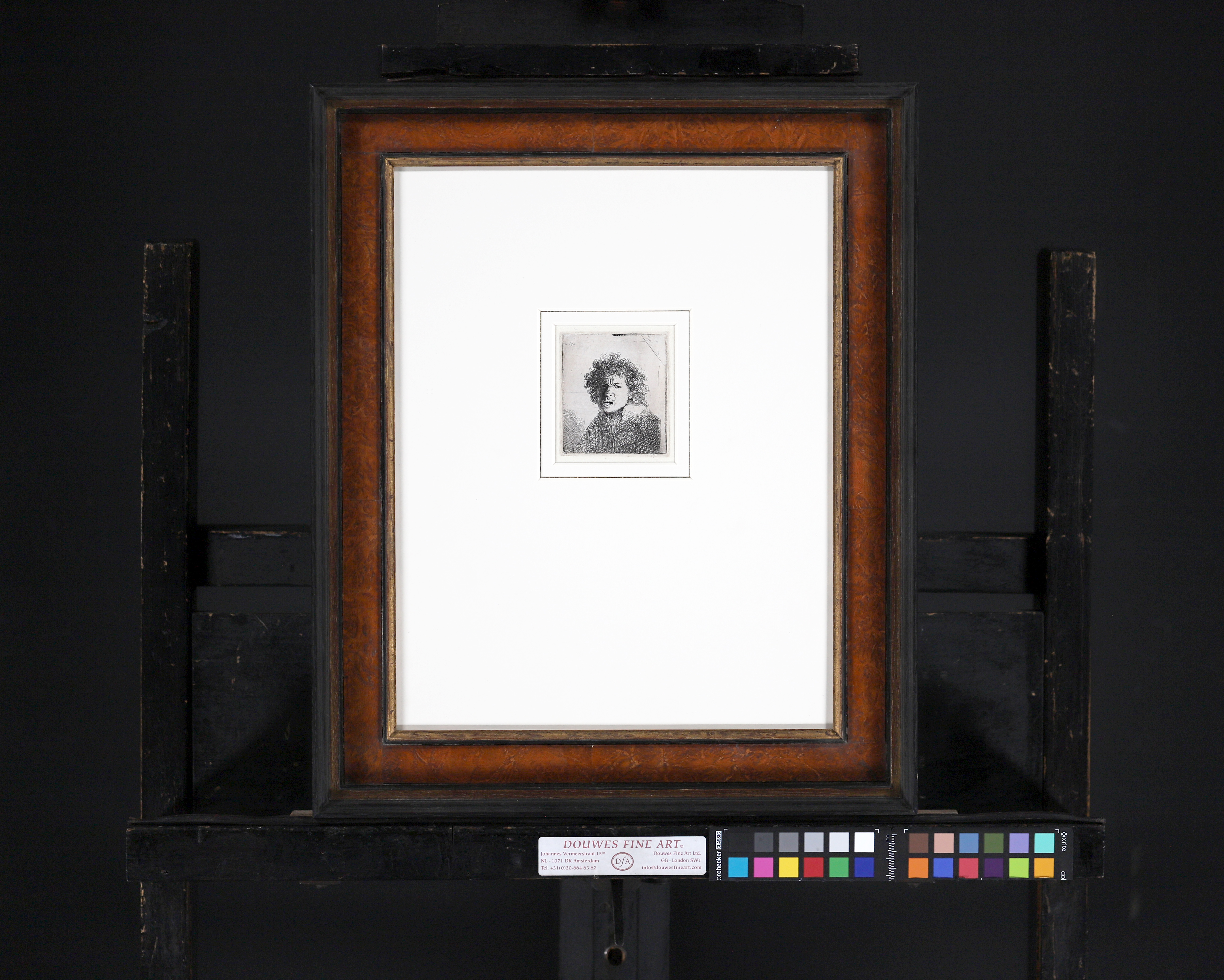 Rembrandt’s etchings are remarkable for their high number of self-portraits (over 30 out of about 290). These are particularly collectible, perhaps due to the smaller number of states as well as the artist’s compelling and powerful presence. Unlike his stately religious scenes, or regal, posed portraits of others, which exhibit his careful and calculating brilliance as an etcher, Rembrandt’s self-portraits reveal him as an artist and a man. In them he assumes the role of the experimenting artist, approaching the most difficult of subjects – himself. These self-portraits are often described as ethereal and wistful for their notable contrasting areas of high and low etched space.